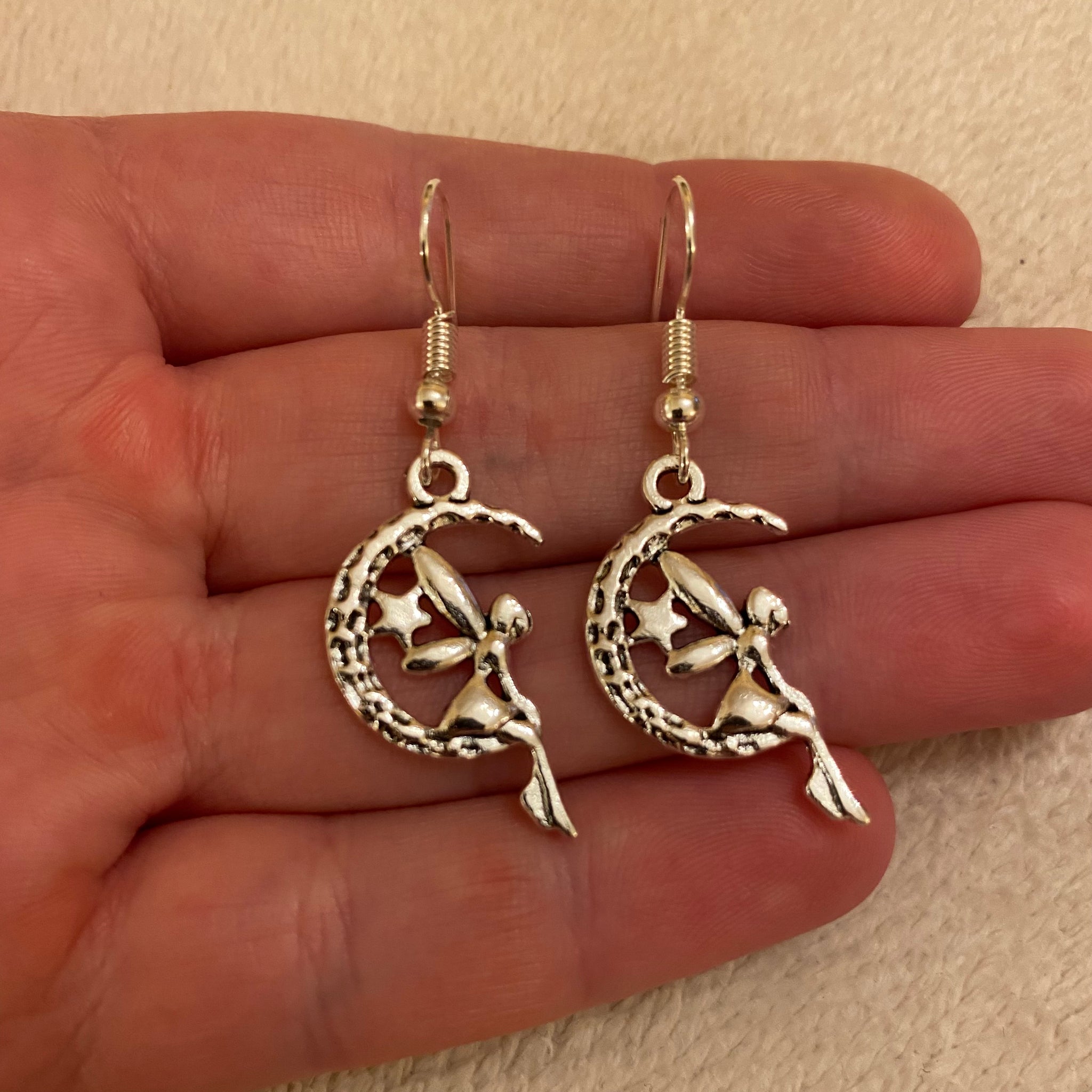 Silver plated dangle/ drop earrings with fairy on the moon charms