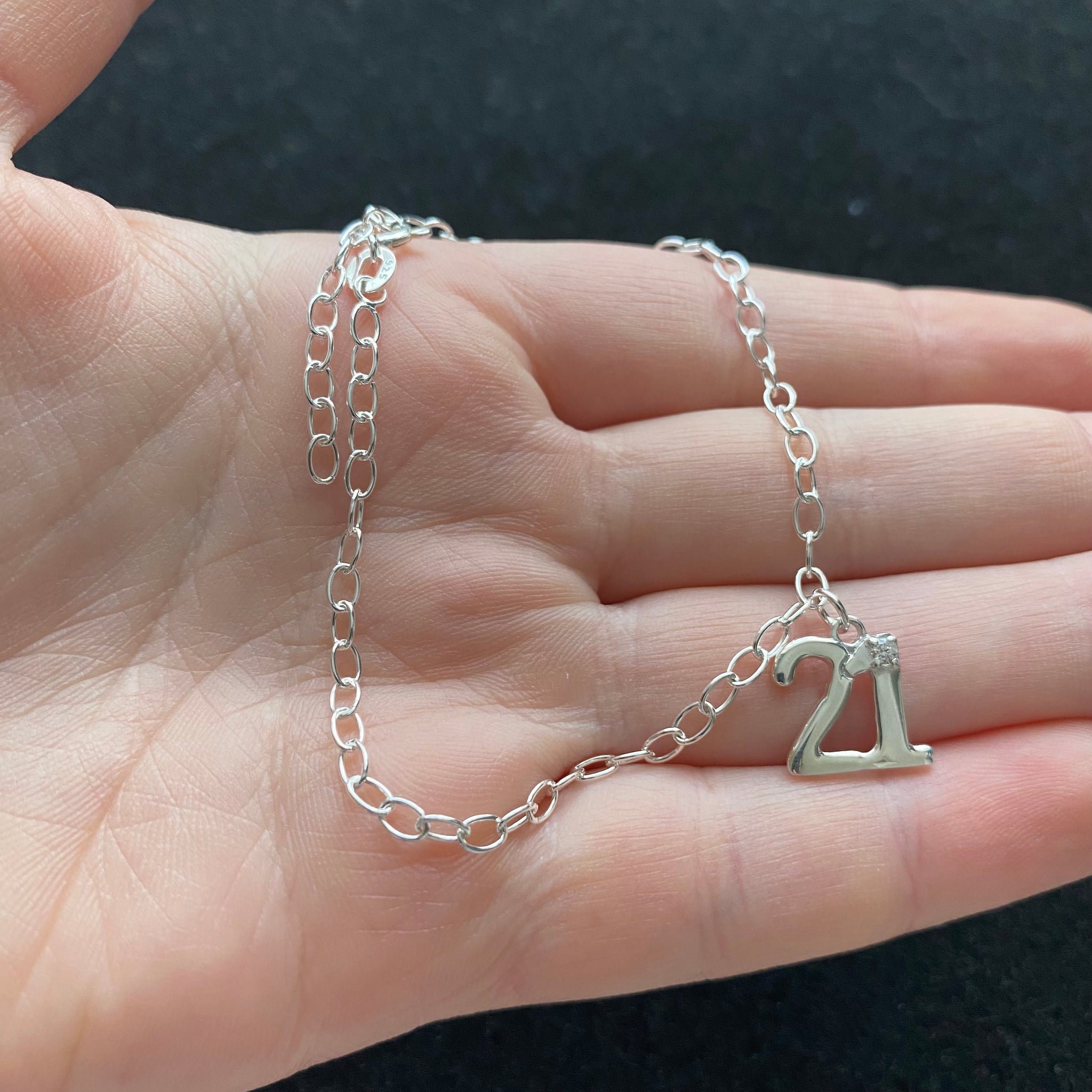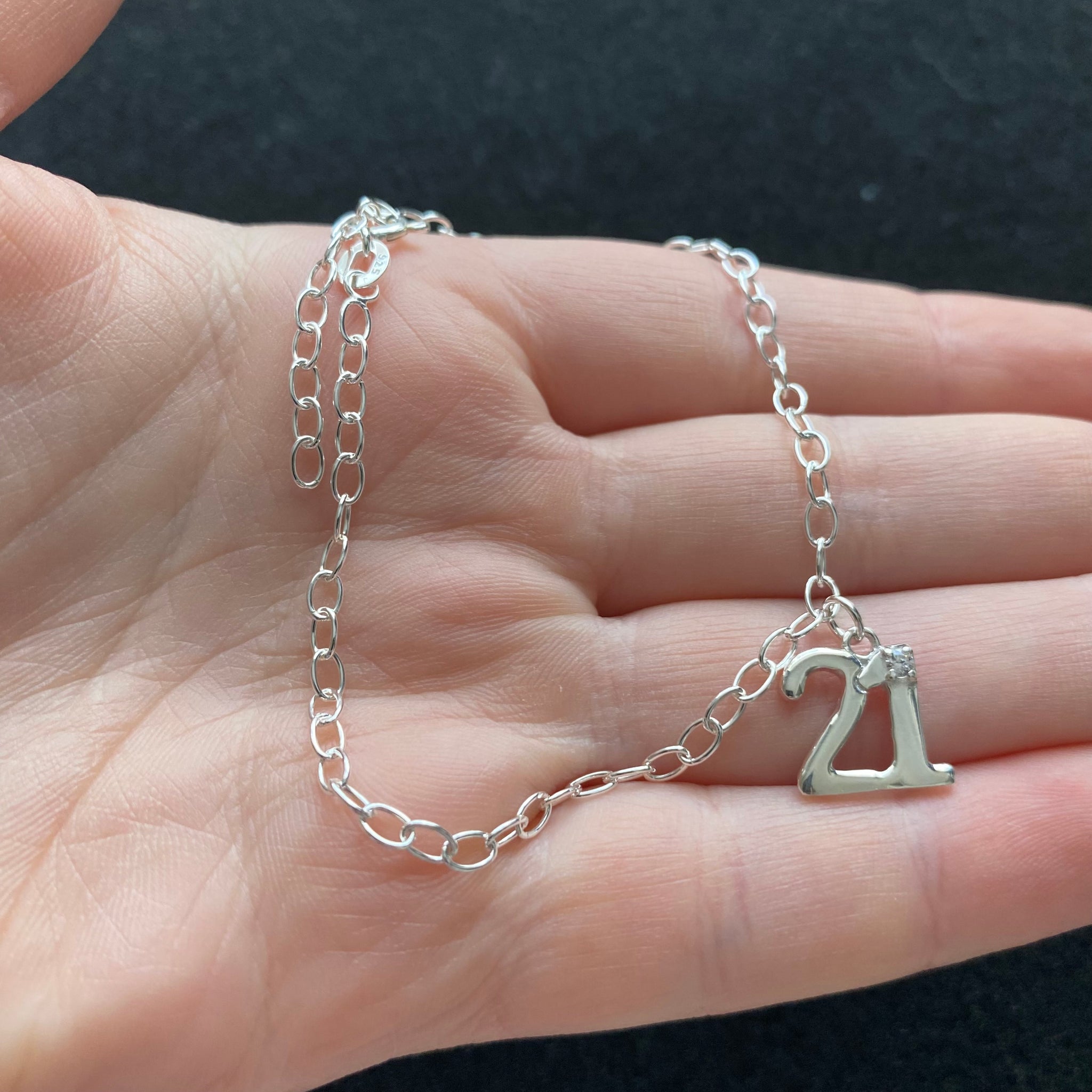 Sterling silver cable chain bracelet with 21 charm