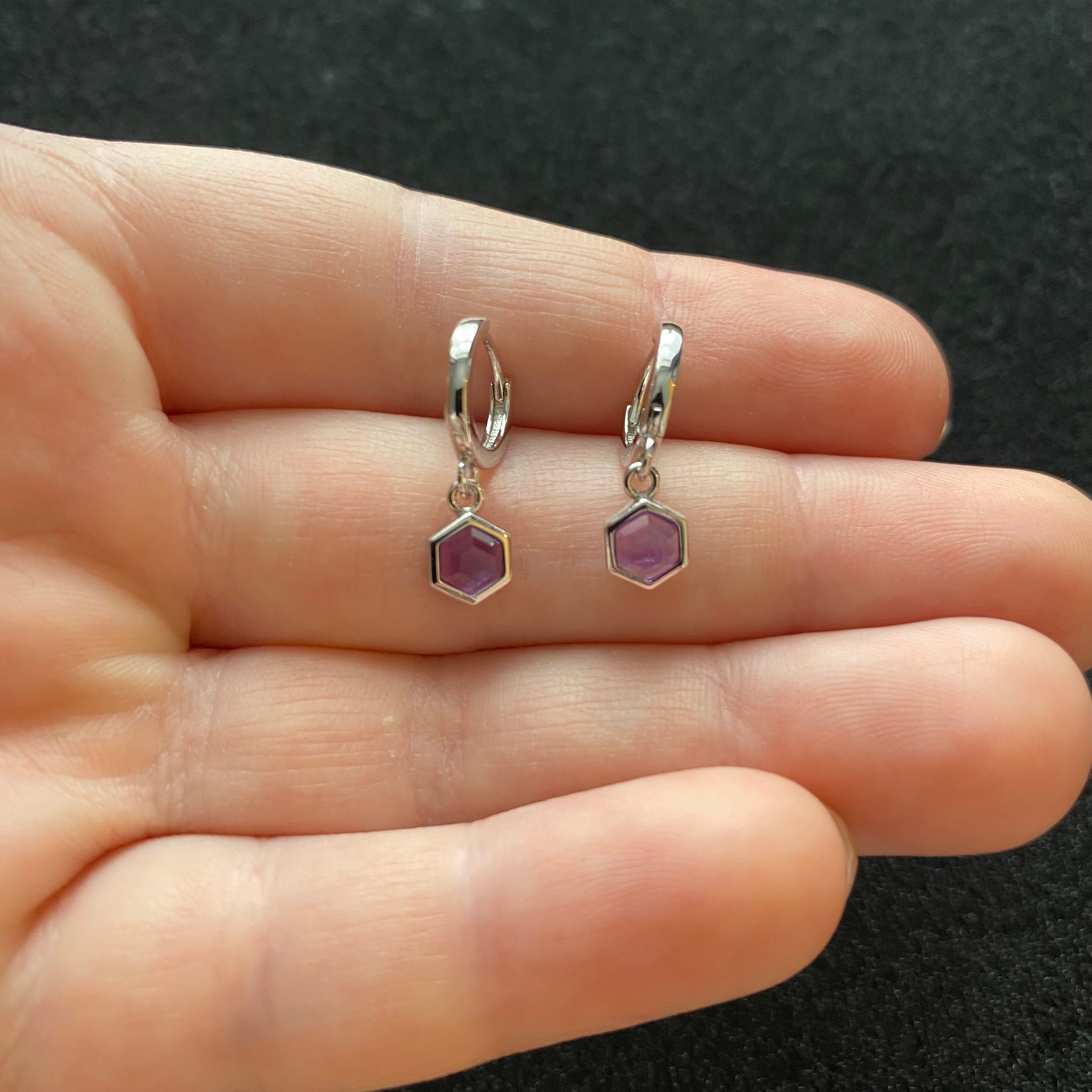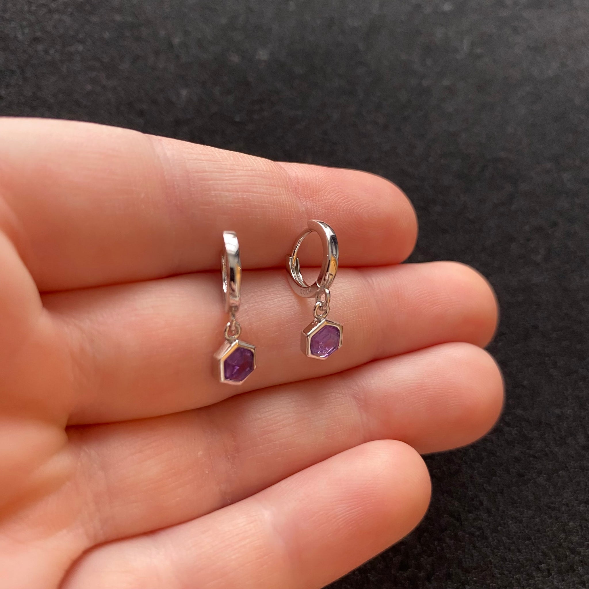 Gorgeous and dainty sterling silver huggie hoop earrings with amethyst (February birthstone) hexagon charmsInner diameter of hoop is 8mmComes in a black box 💫💫