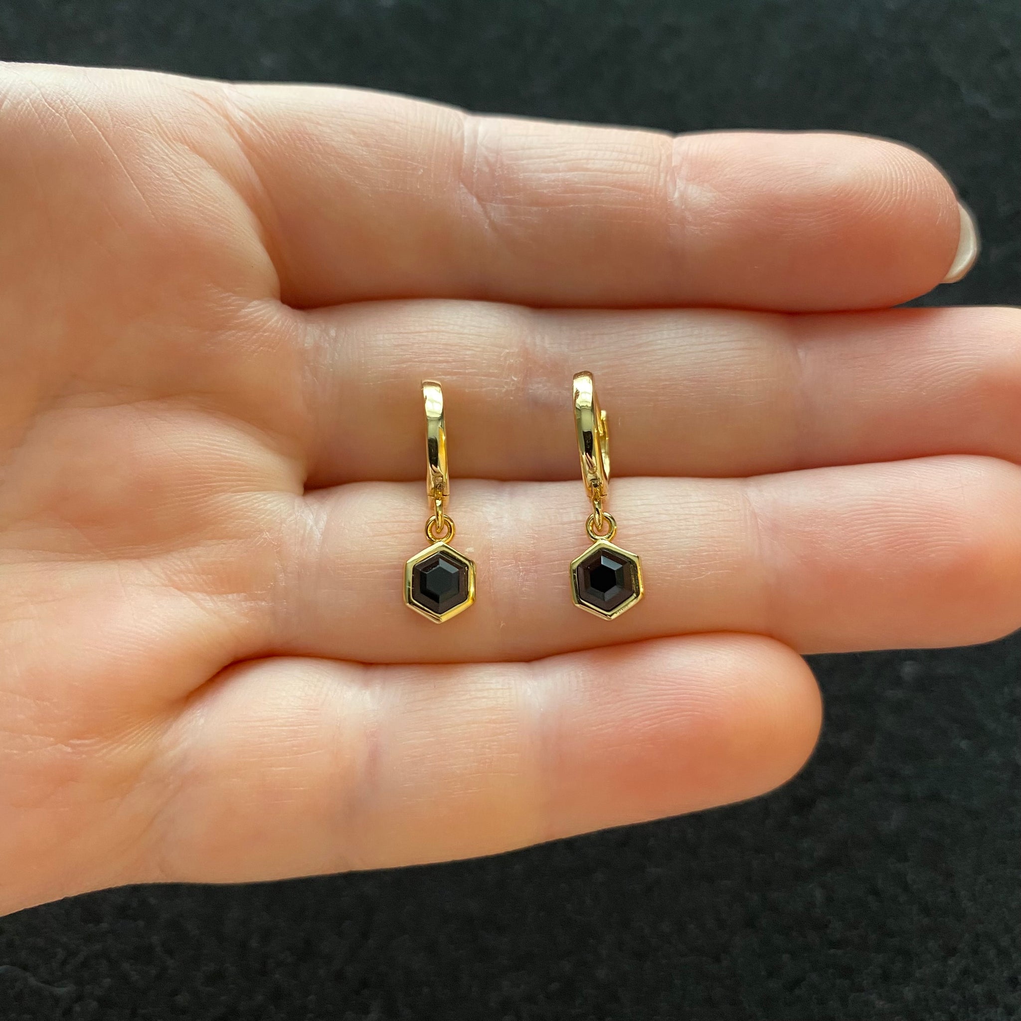 Gorgeous and dainty 18K gold plated sterling silver huggie hoop earrings with black onyx hexagon charmsInner diameter of hoop is 8mmComes in a black box 💫💫