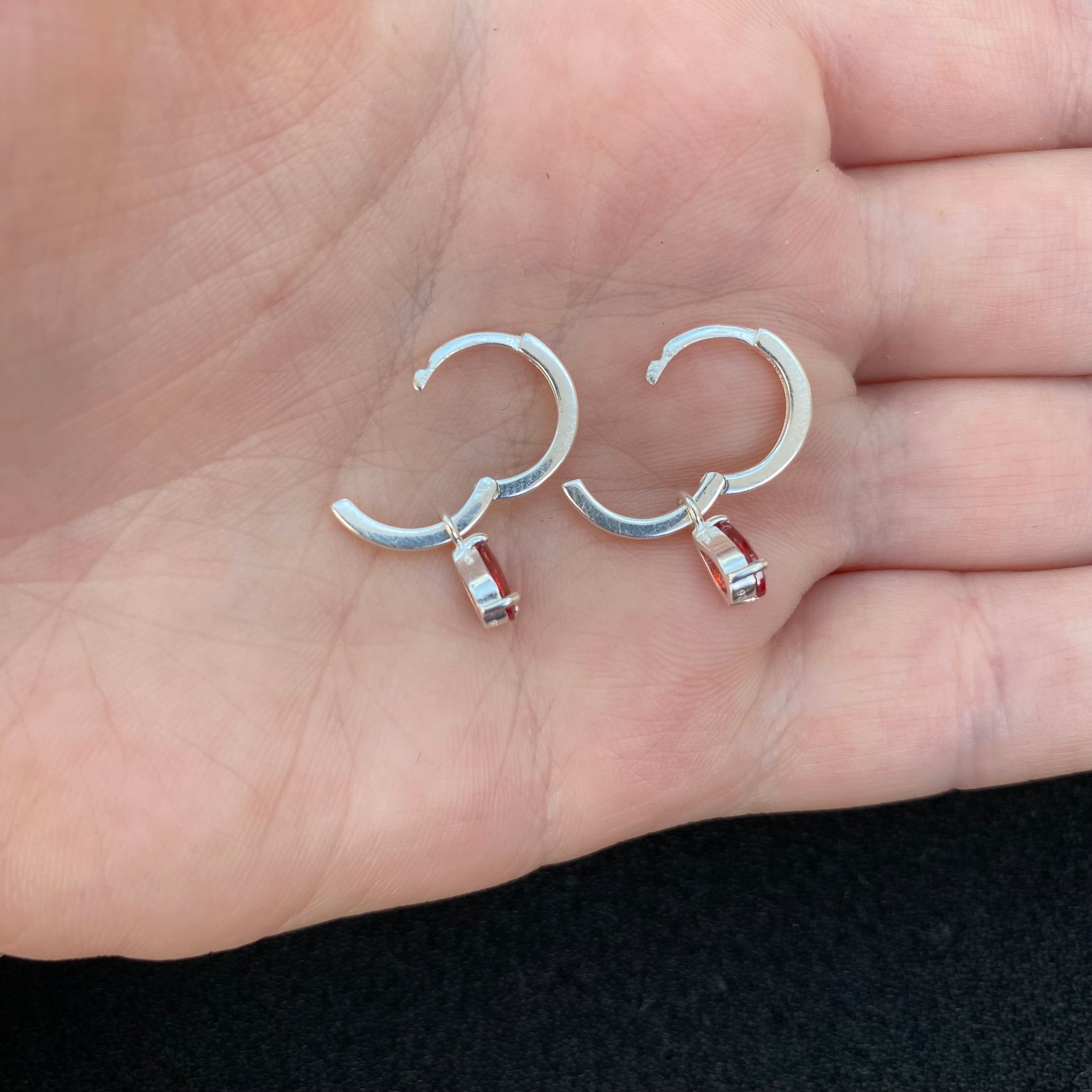 Sterling silver huggie hoop earrings with synthetic garnet teardrop charms